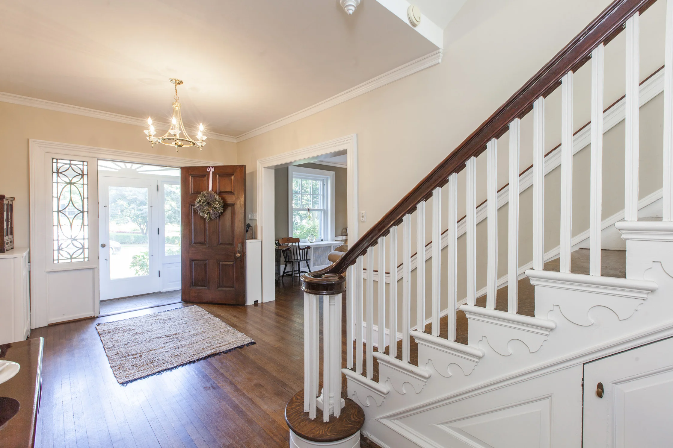 On a majestic tree-lined street in Jenkintown sits this Colonial style home. Beautiful greenery with spring summer blooms compliments the front of the home. Enter through a vestibule into the wide open inviting foyer with finished hardwood floors that are throughout most of home, as well as crown molding throughout and walk-in coat closet.